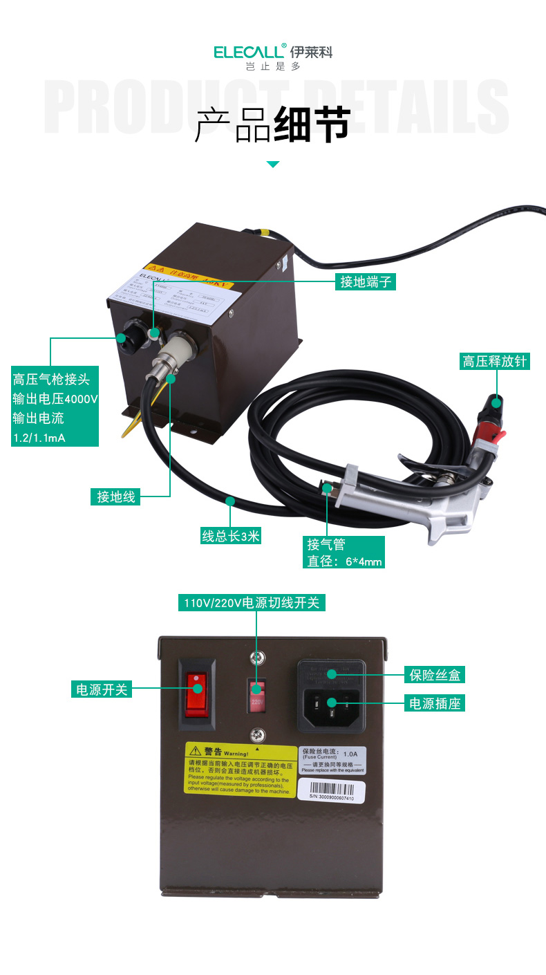 伊莱科除尘离子风枪离子吹尘枪含电源供应器静电消除器ES4000