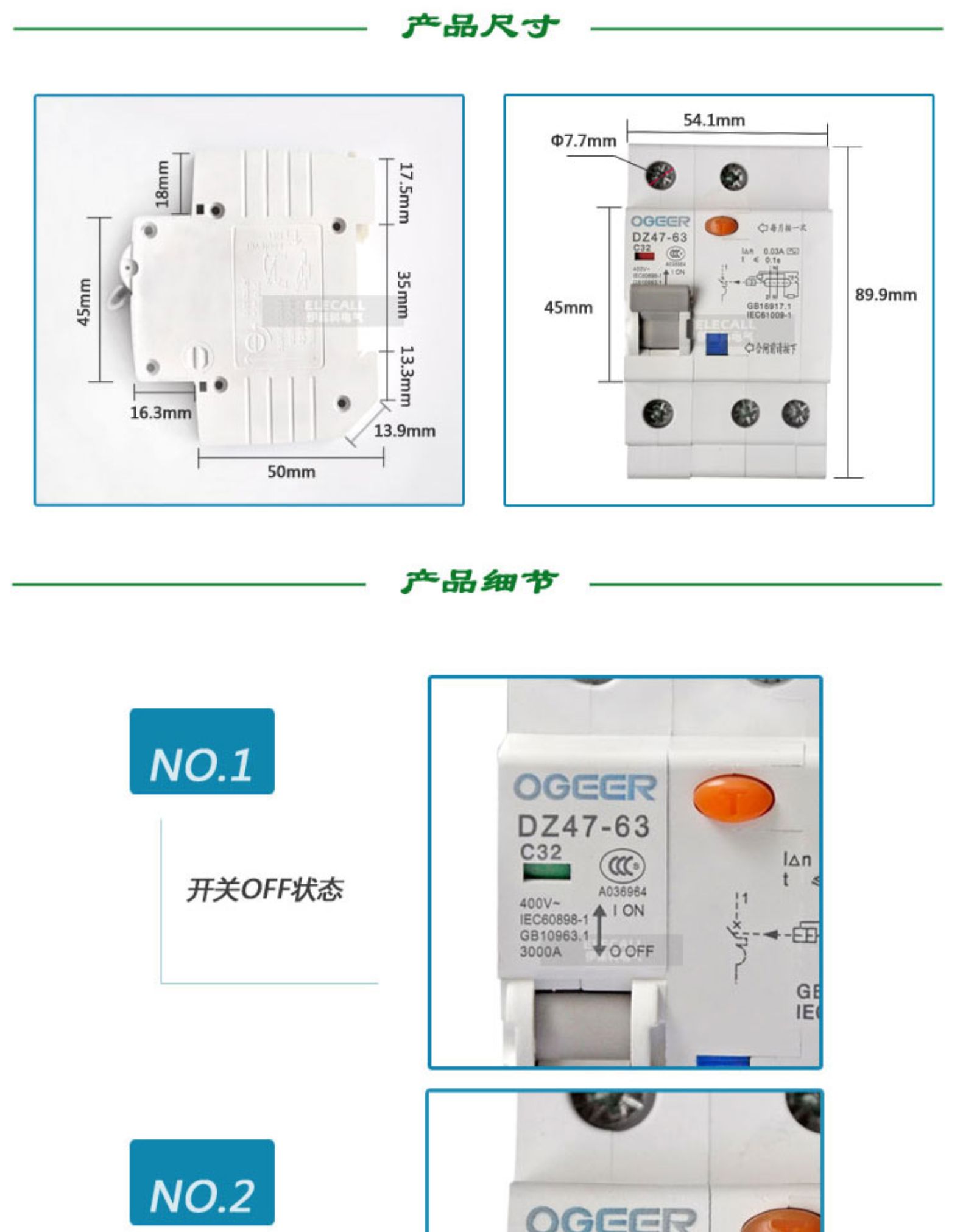 • 欧捷小型漏电断路器 DZ47LE-63 2P 63A