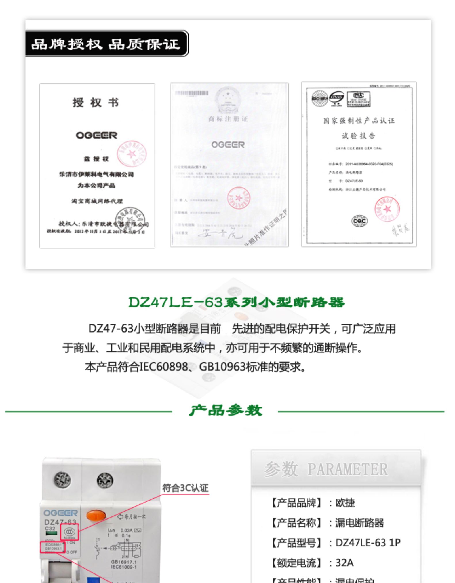 欧捷 漏电断路器漏电 触电保护开关 DZ47LE-631P2P3P空气开关