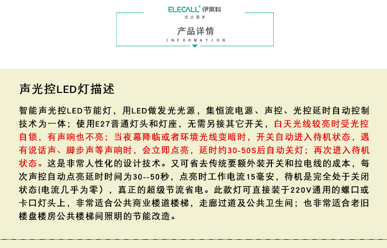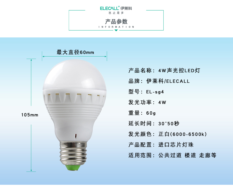 伊莱科 声光控LED节能灯 节能灯 e27节能灯 EL-SG4(冷光)