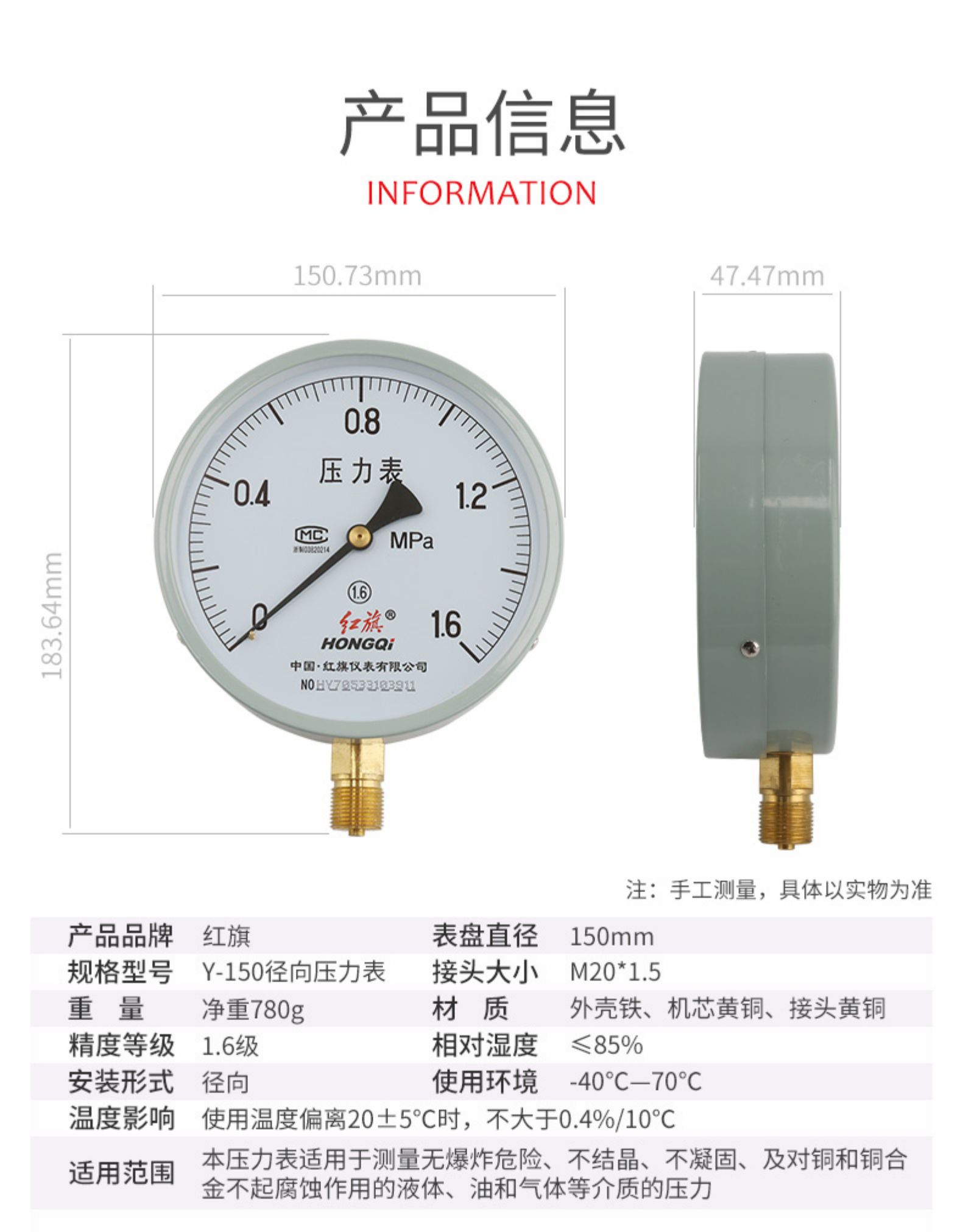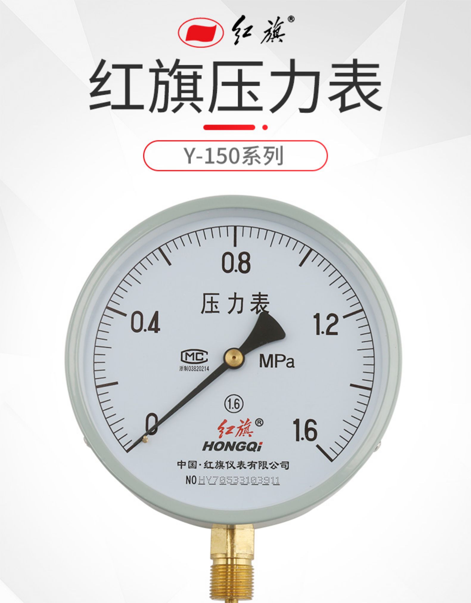 红旗普通压力表 Y-150 径向 水压表 气压表 油压表 0-60MPA全规格
