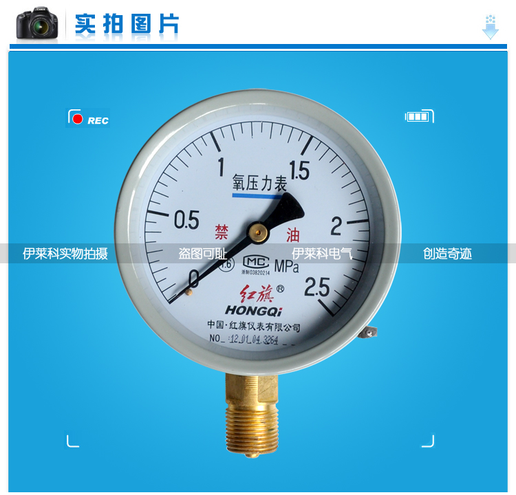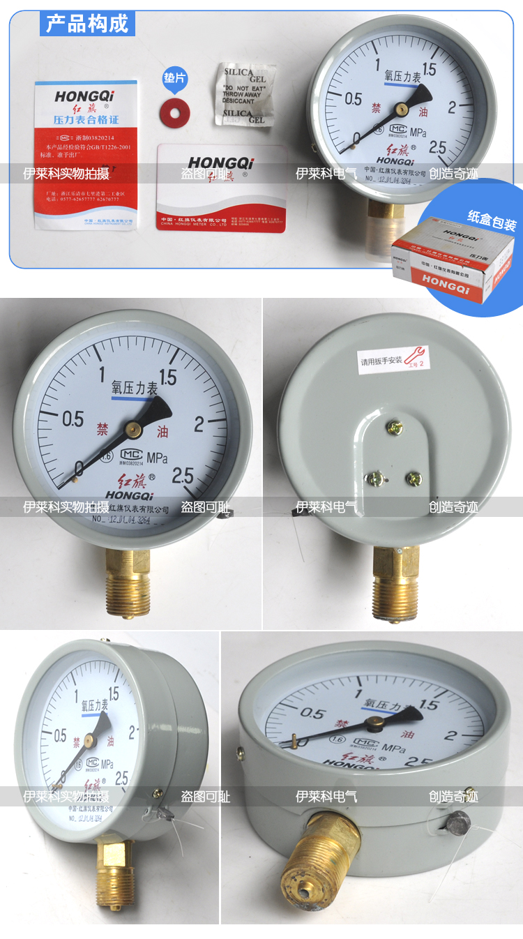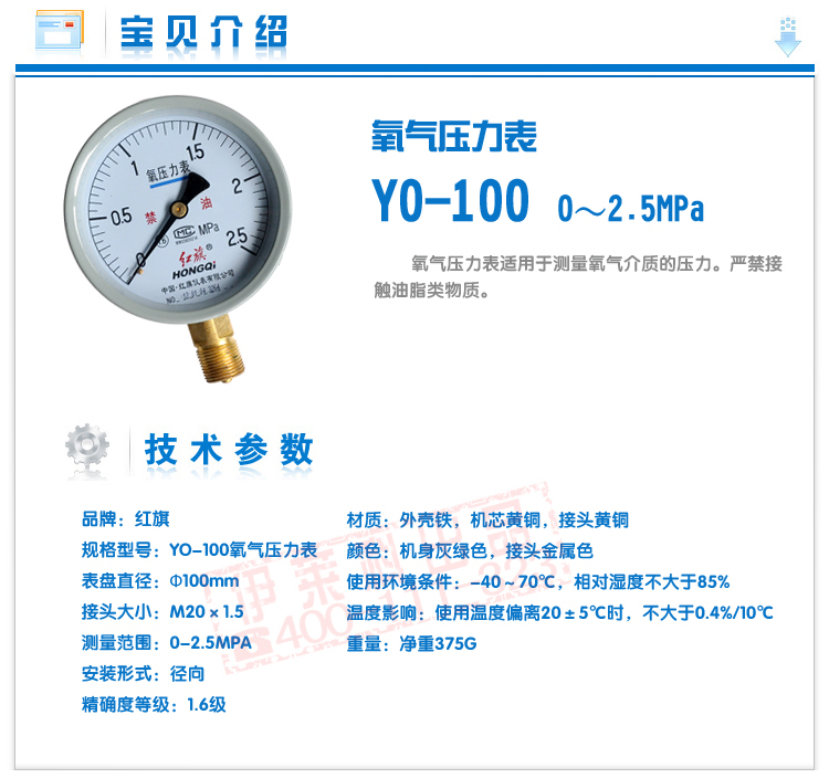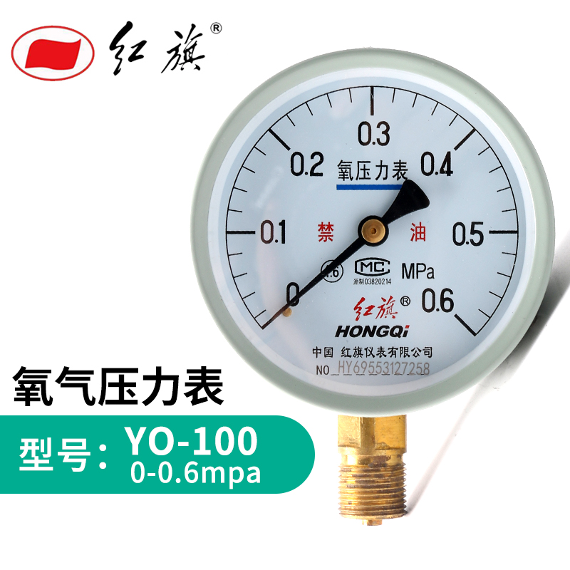 红旗氧气压力表 YO-100 径向 0-60Mpa规格量程齐全 氧气表 需定制