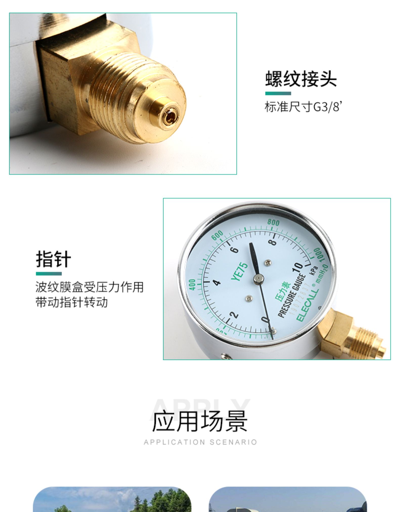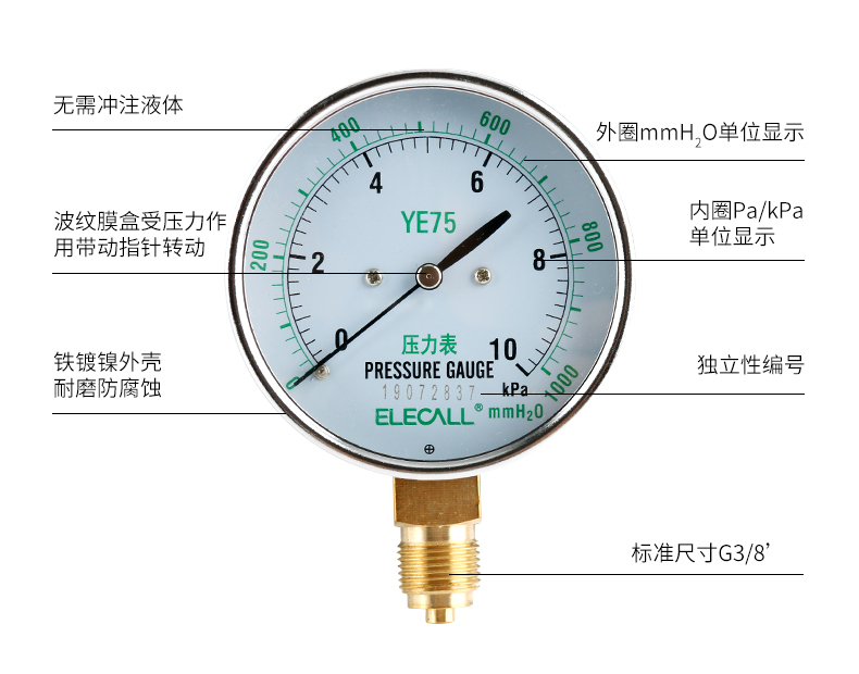 • 伊莱科 膜盒压力表YE-100 微压表 全规格多量程可选 KPA 千帕表