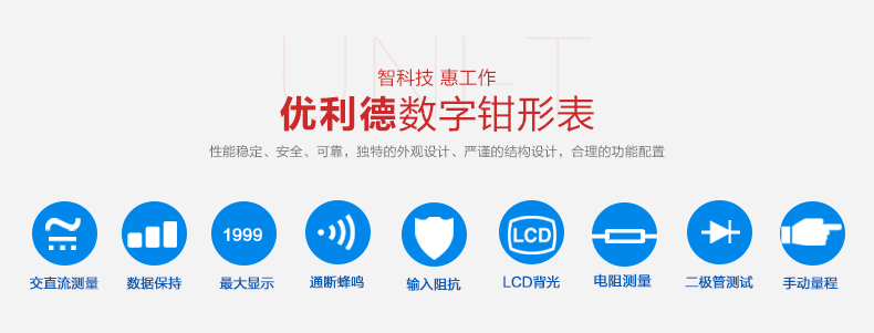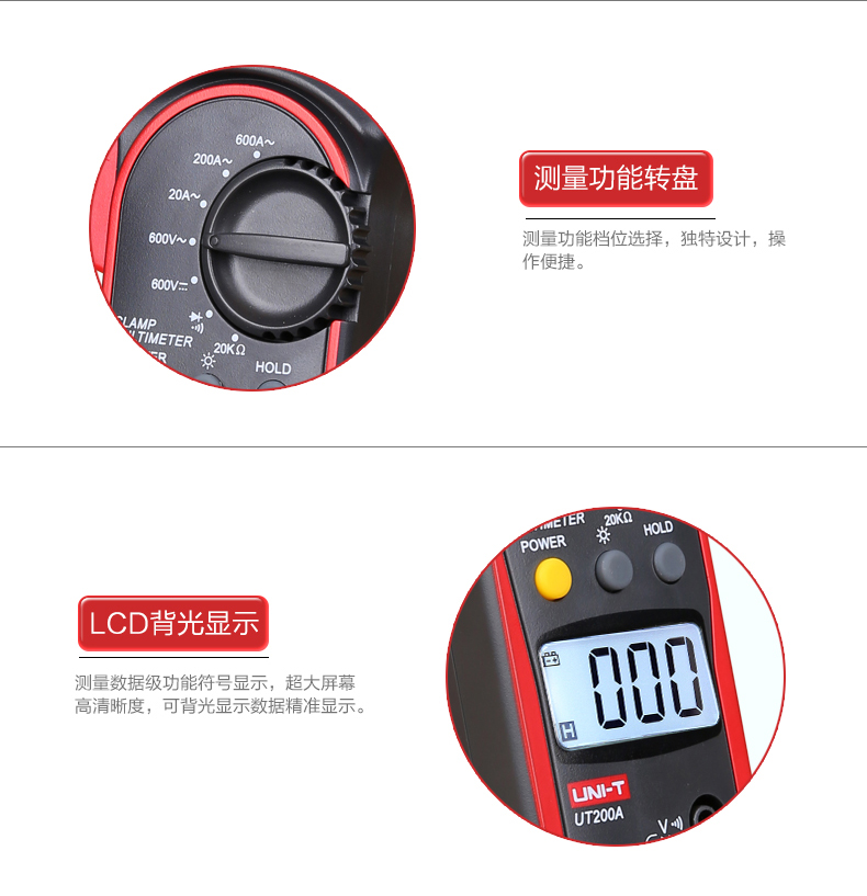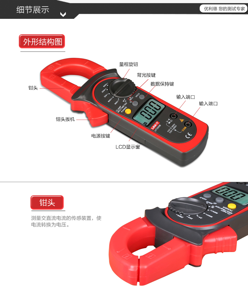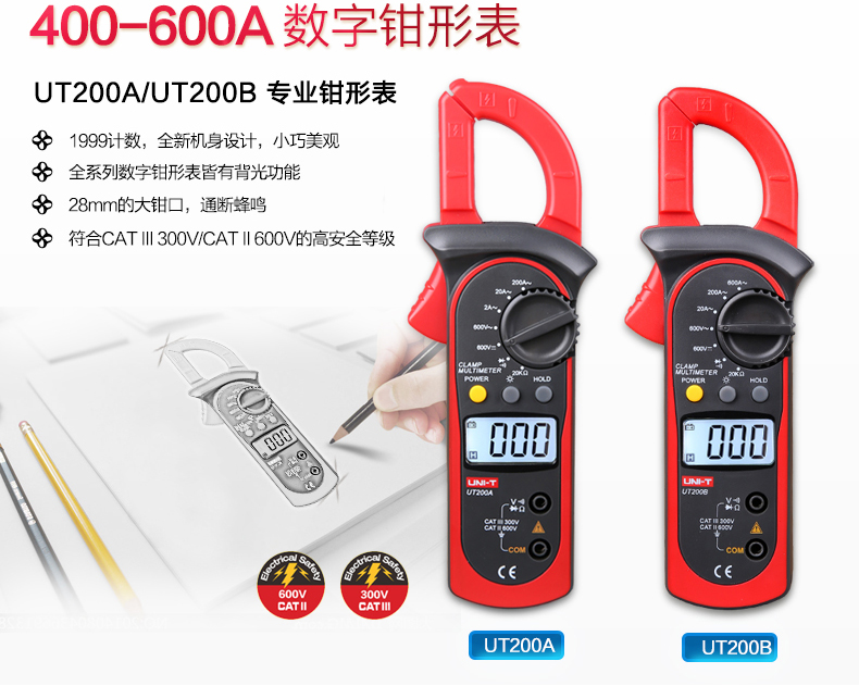 • 优利德万用表数字钳形表UT200A/B/C交直流钳表电工数显电流表钳型