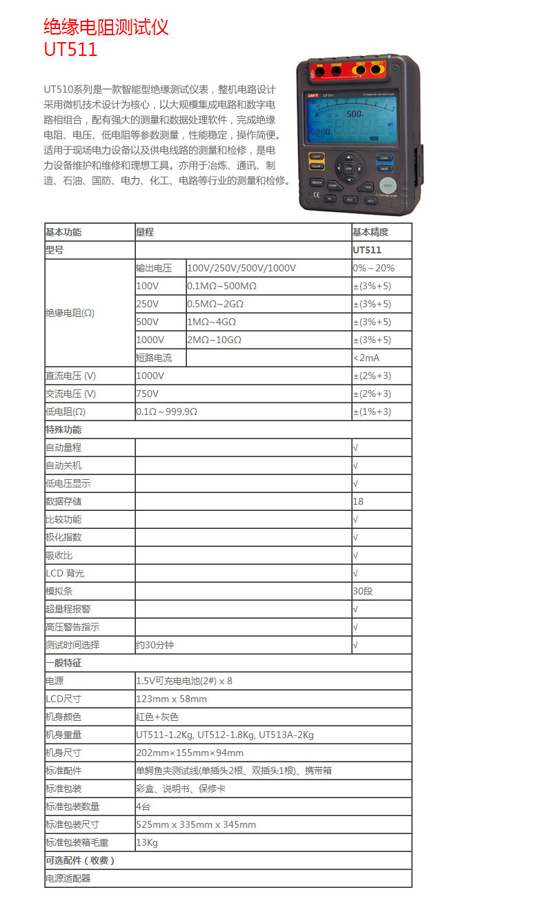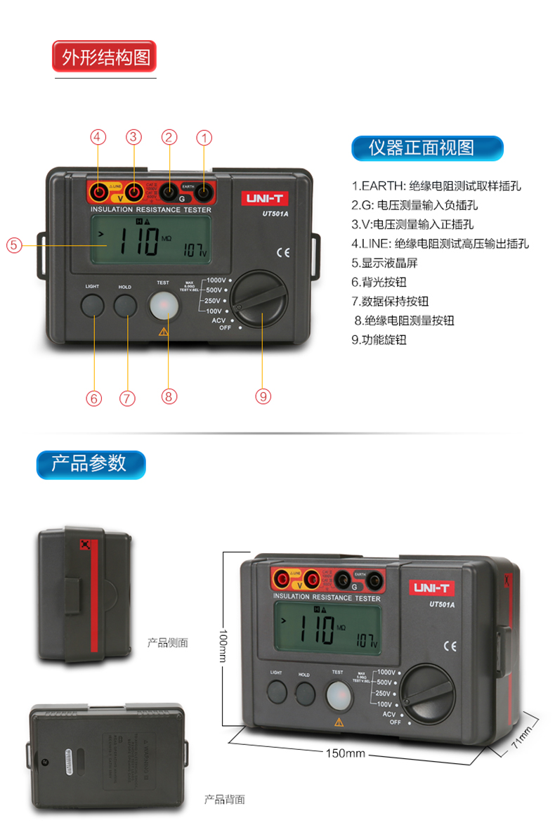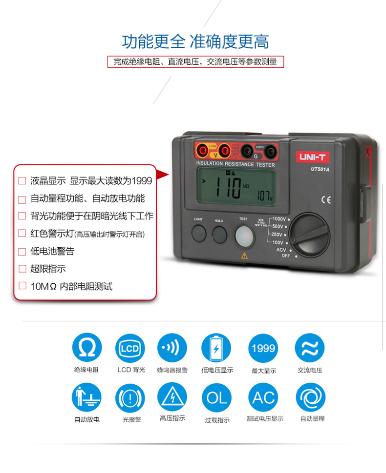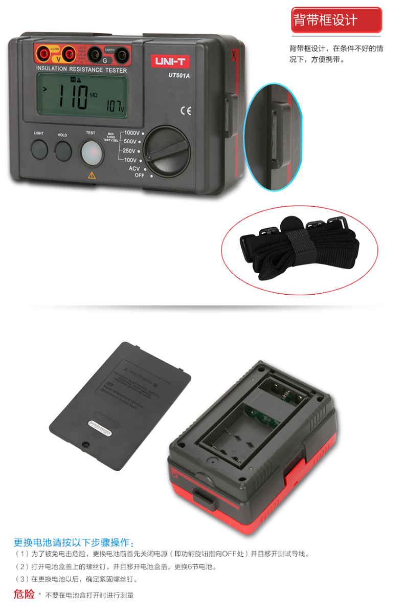 • 优利德数字绝缘电阻测试仪UT500系列数显兆欧表绝缘摇表UT502A