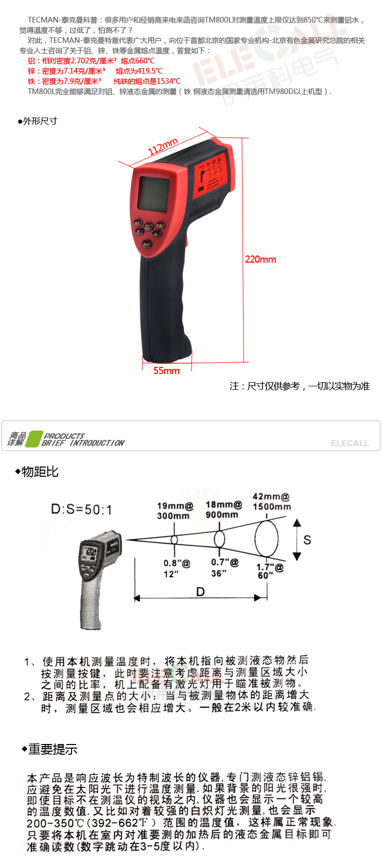 泰克曼TM800L 铝水红外测温仪水冶炼专用测温枪200-850℃