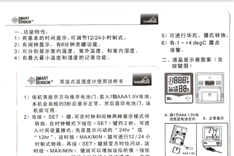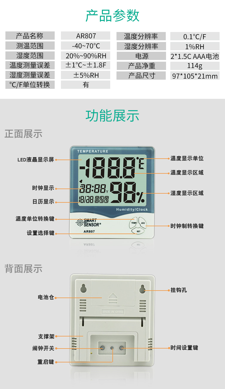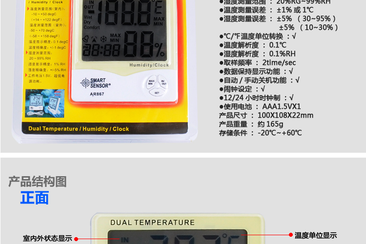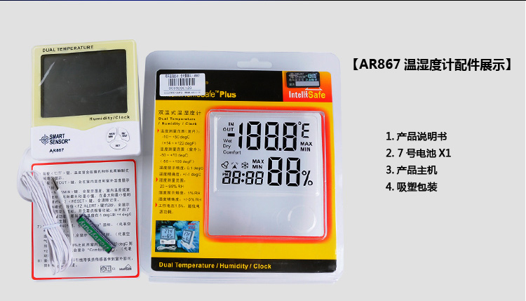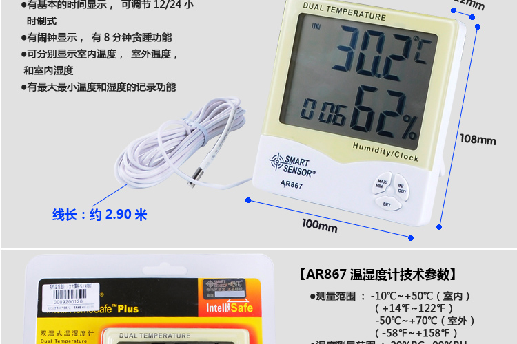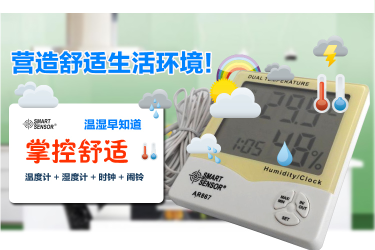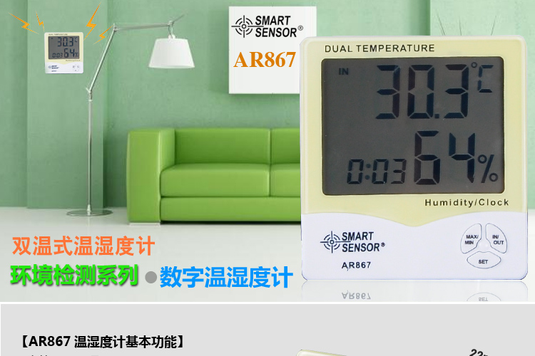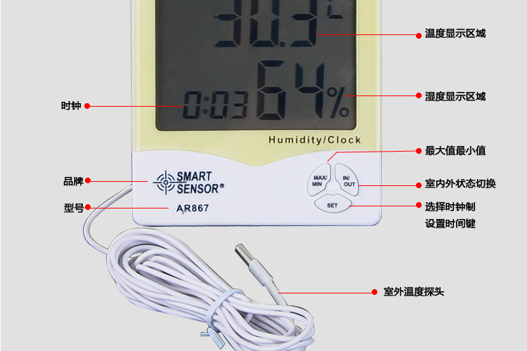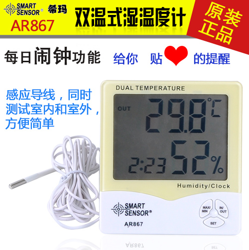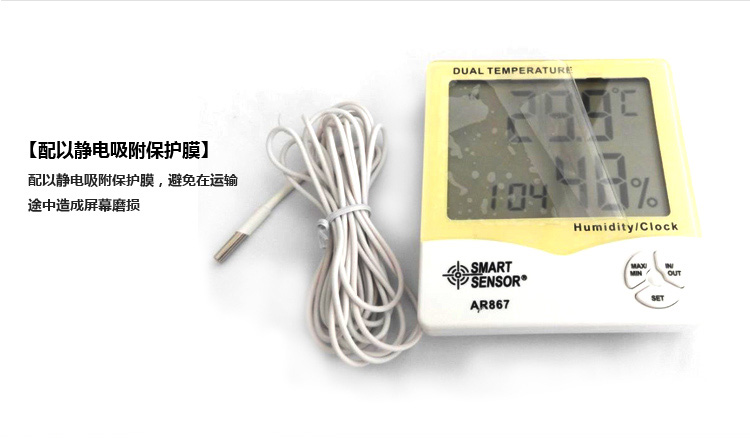 • 希玛AR867家用双温湿度计 外置测温探头 温湿度测量仪AR807升级版