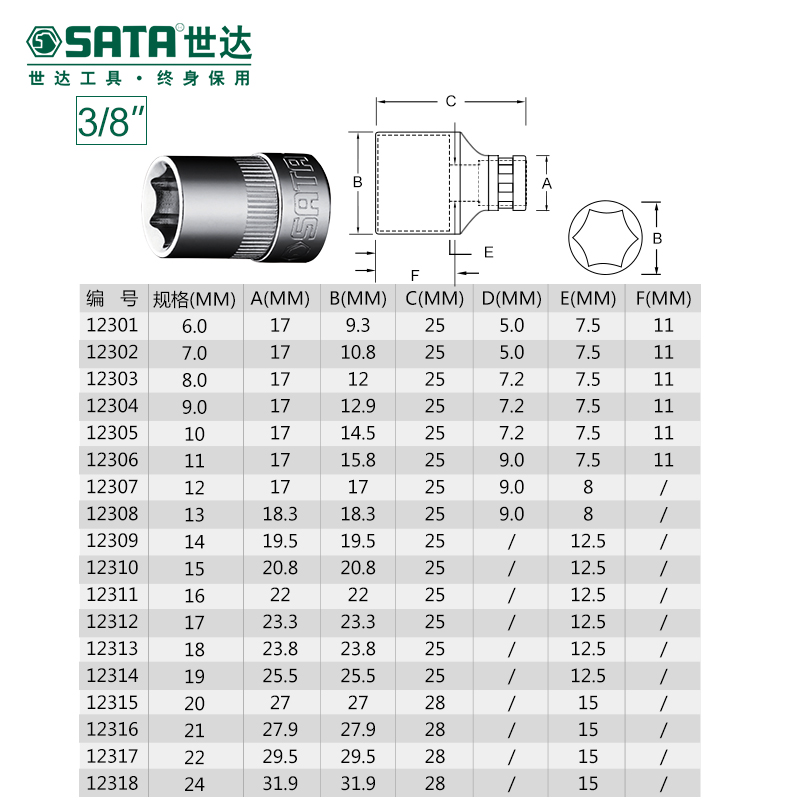 世达工具套筒五金中飞套筒头10MM六6角套筒3/8套筒扳手汽机修工具
